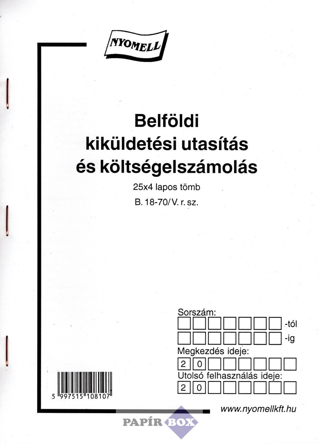 Sorszámozott, önátírós nyomtatvány.
