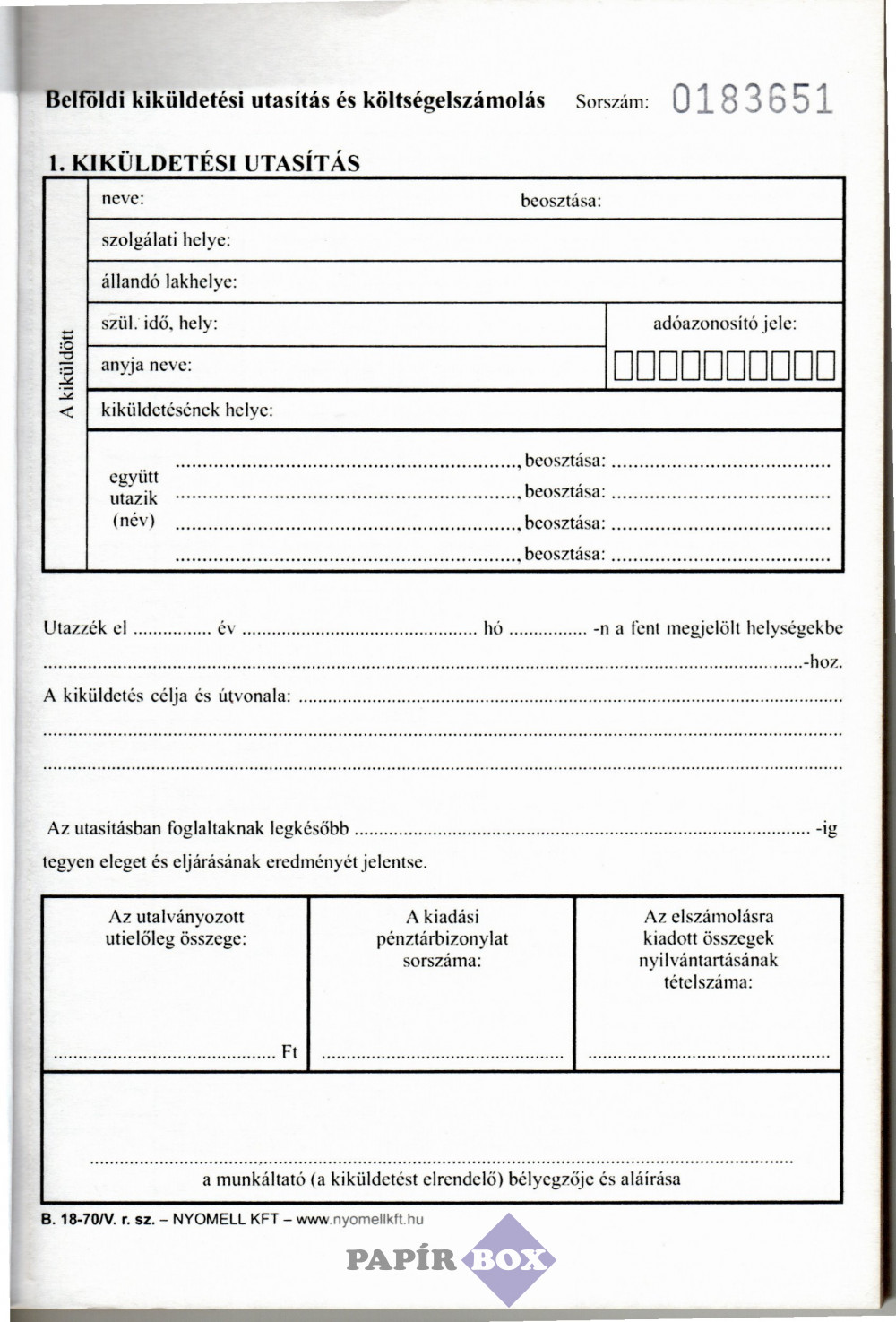 B.18-70 Belföldi kiküldetési utasítás és költségelszámolás A/5 25x4