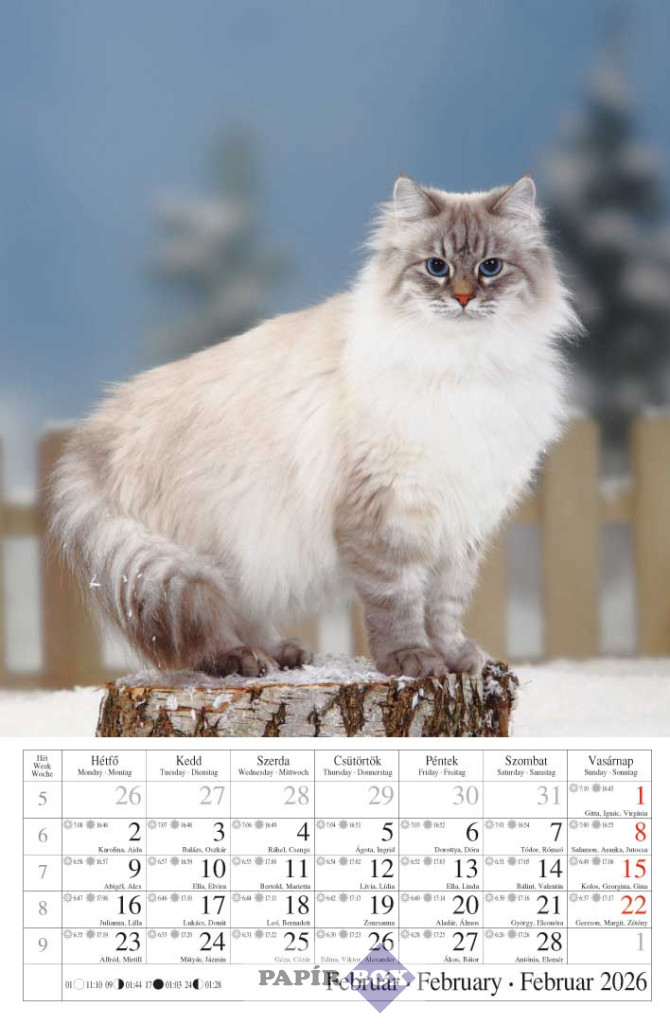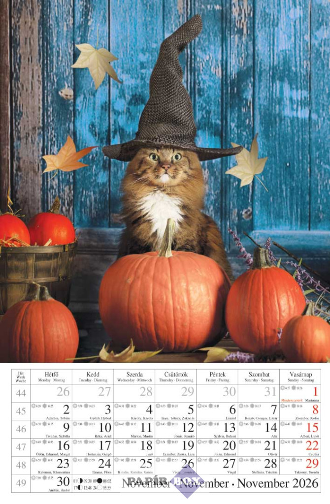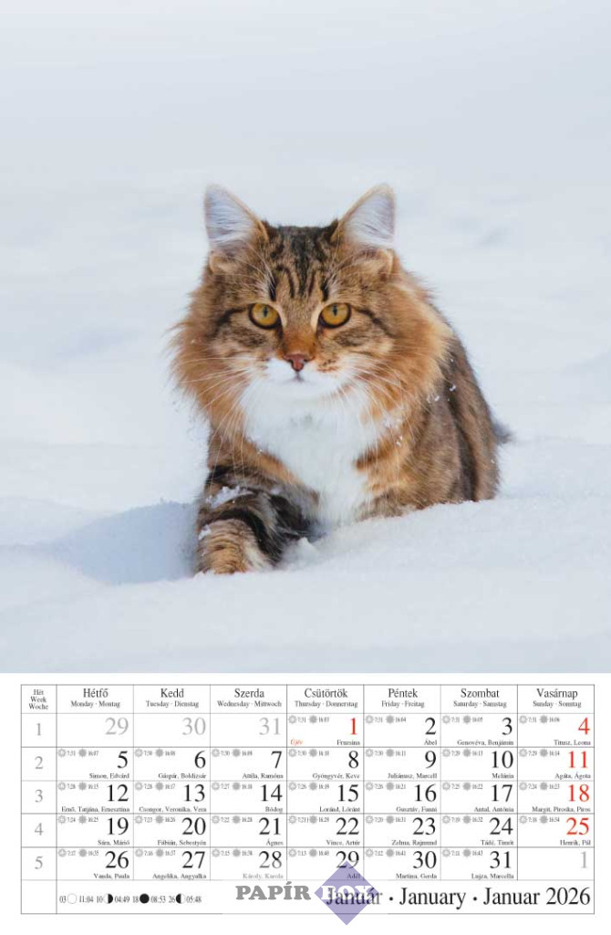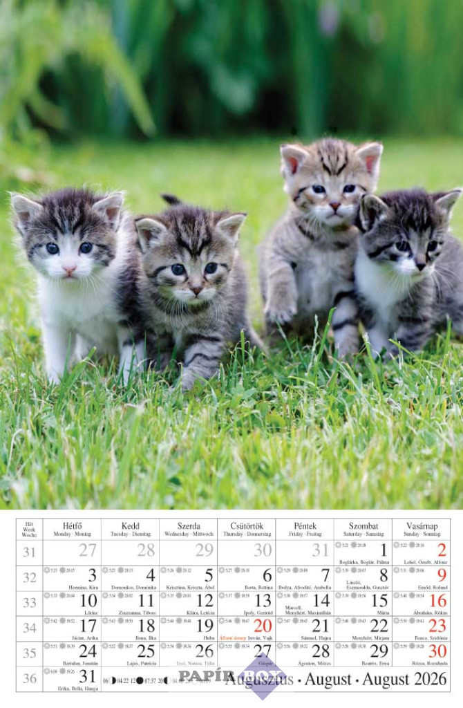 -naptár rész: magyar, angol, német nyelven, magyar ünnepek és névnapokkal, napkelte, napnyugta és holdállás feltüntetésével