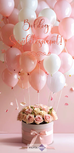 Képeslap, Születésnap, Virágdoboz lufikkal